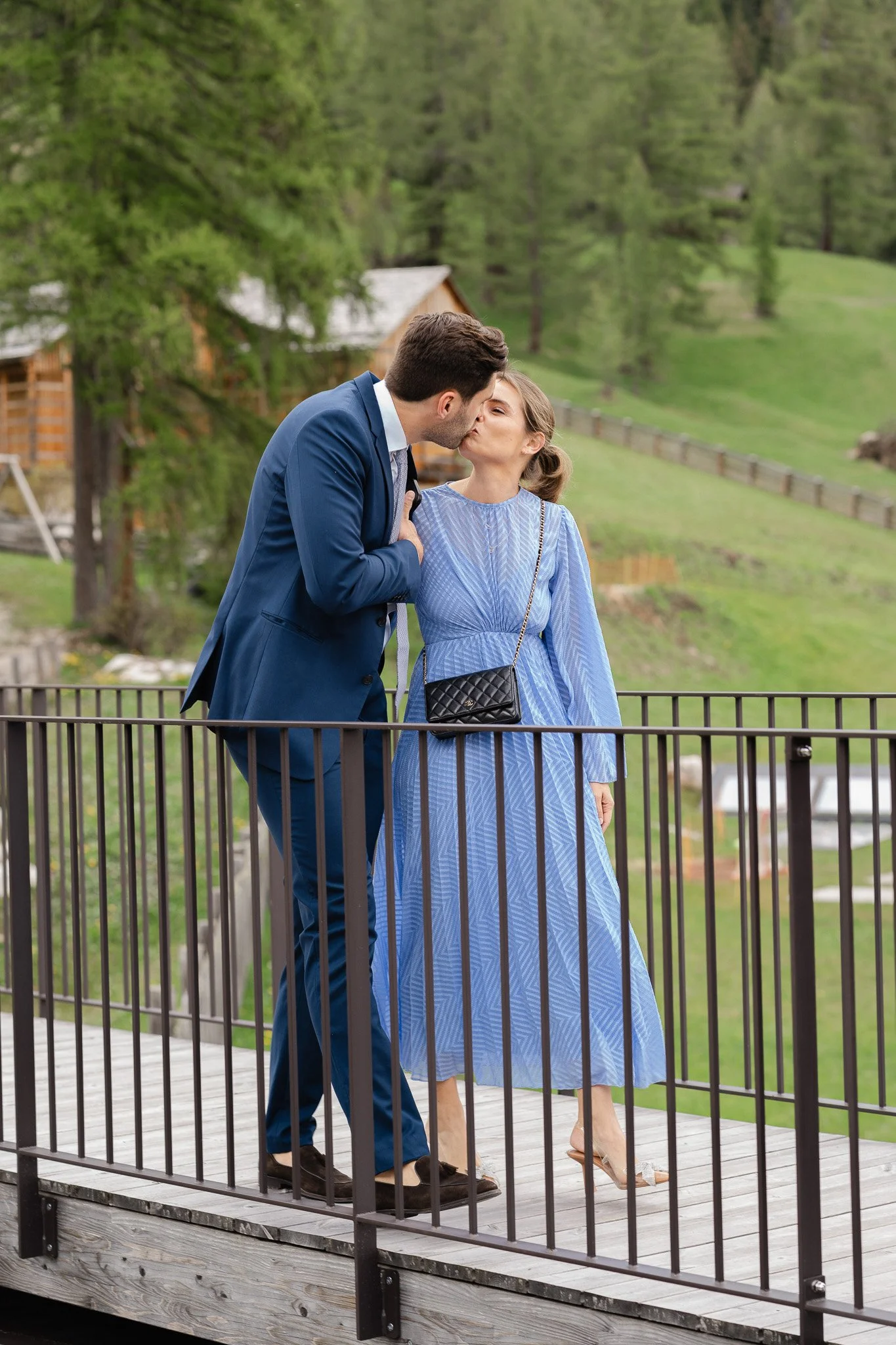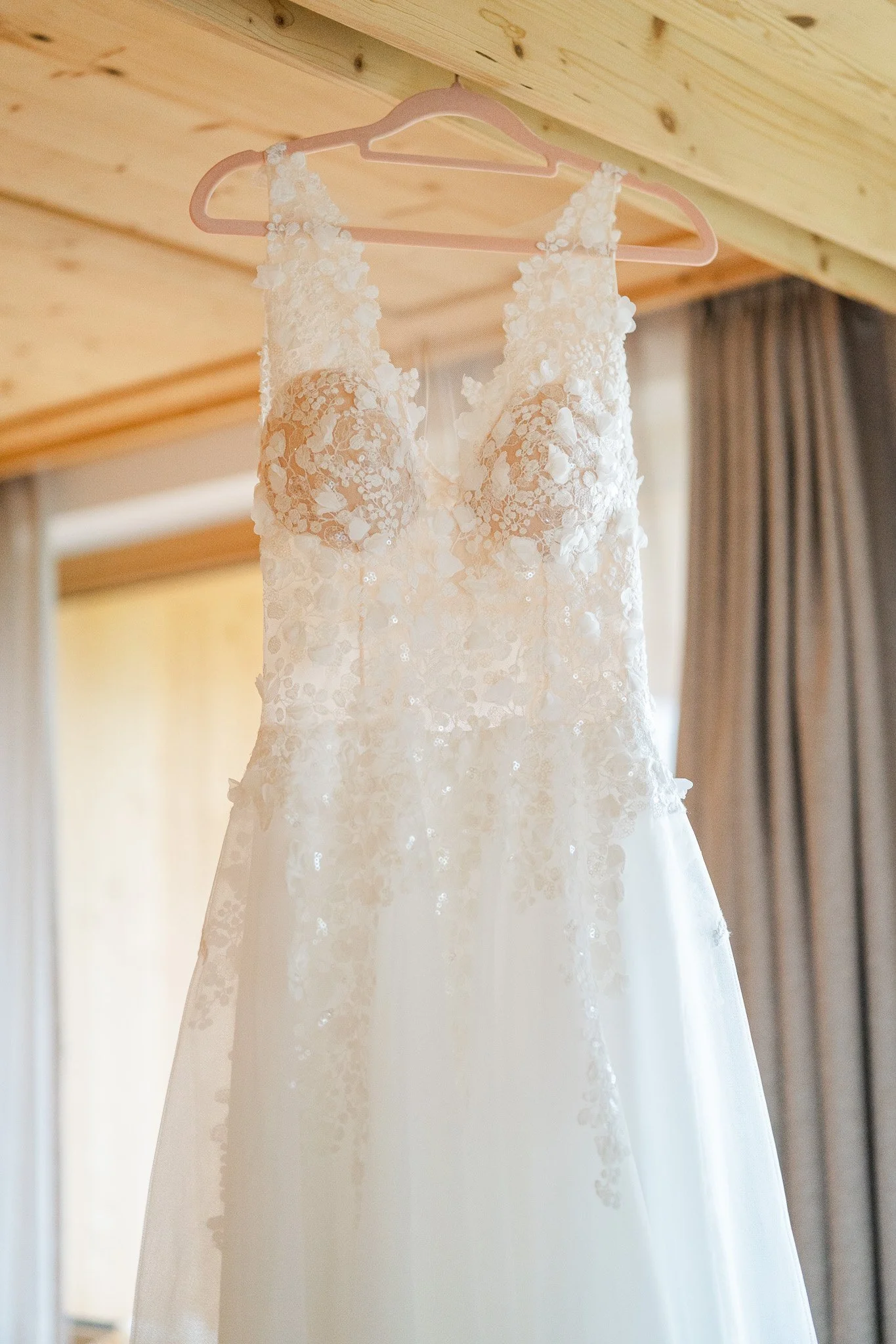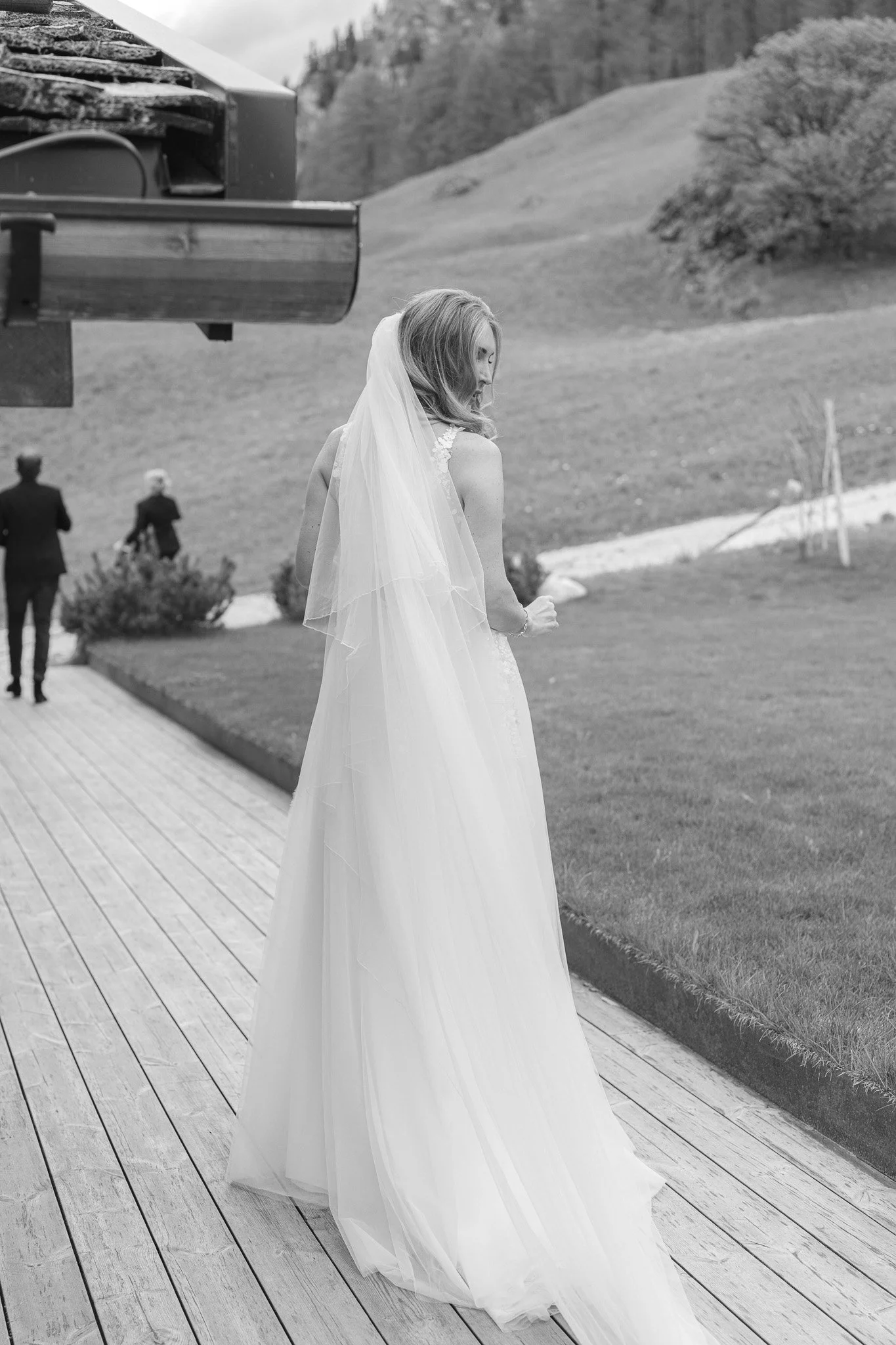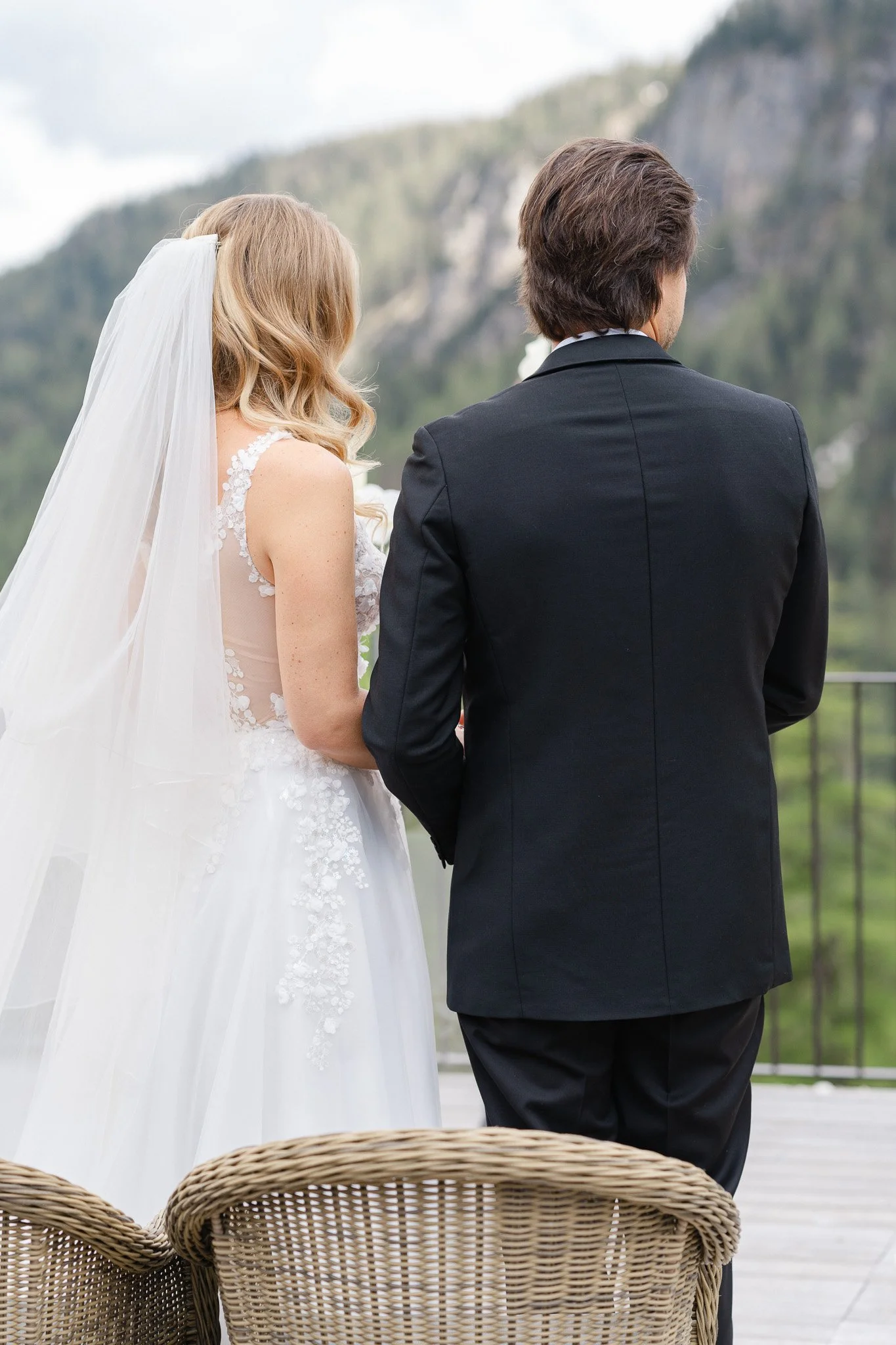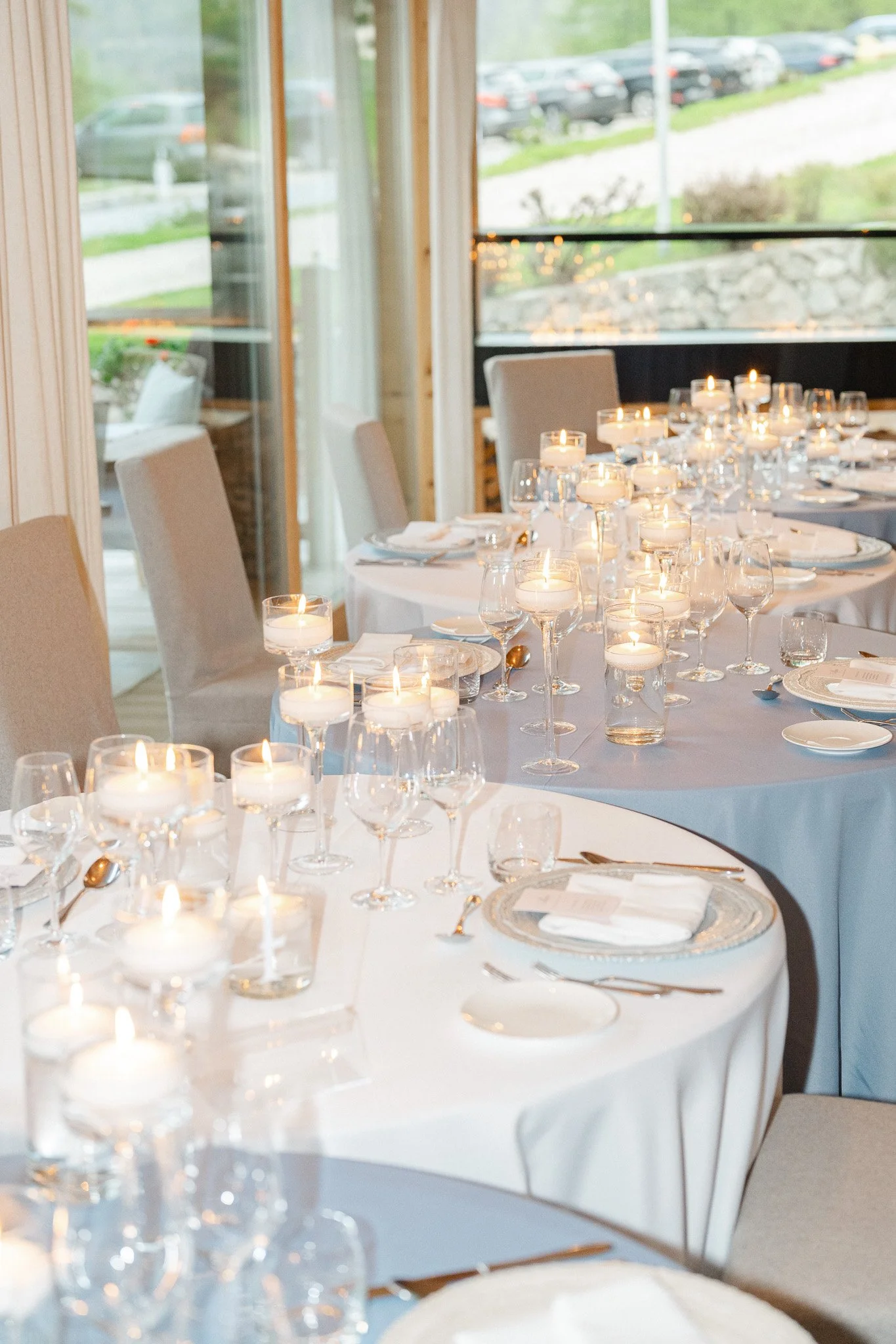 The venue perfectly blended elegance and modernity with stunning mountain views. Anja wore a classic and dreamy dress that perfectly complemented the serene mountain backdrop. After the getting ready session, followed by an intimate first look, the mountain view ceremony was a breathtaking highlight. The reception was nothing short of spectacular, featuring a towering wedding cake that was as delicious as it was beautiful. Besides the mountain scenery, a breathtaking modern table setting with thousands of candles and heartwarming songs performed by a live singer, guests were treated to a wood-fire pizza party, adding a warm and casual touch to the festivities. The after-party was unforgettable, with Anja and Konstantin's powerful first dance setting the tone for the celebration. Every detail was meticulously planned, creating a day full of love and joy. The evening ended with guests under the stars, reminiscing about the day's beautiful moments.