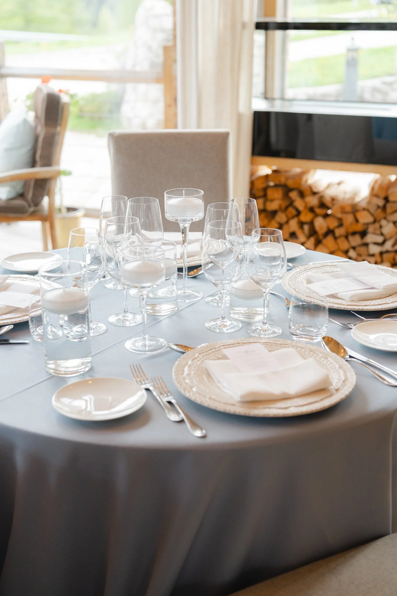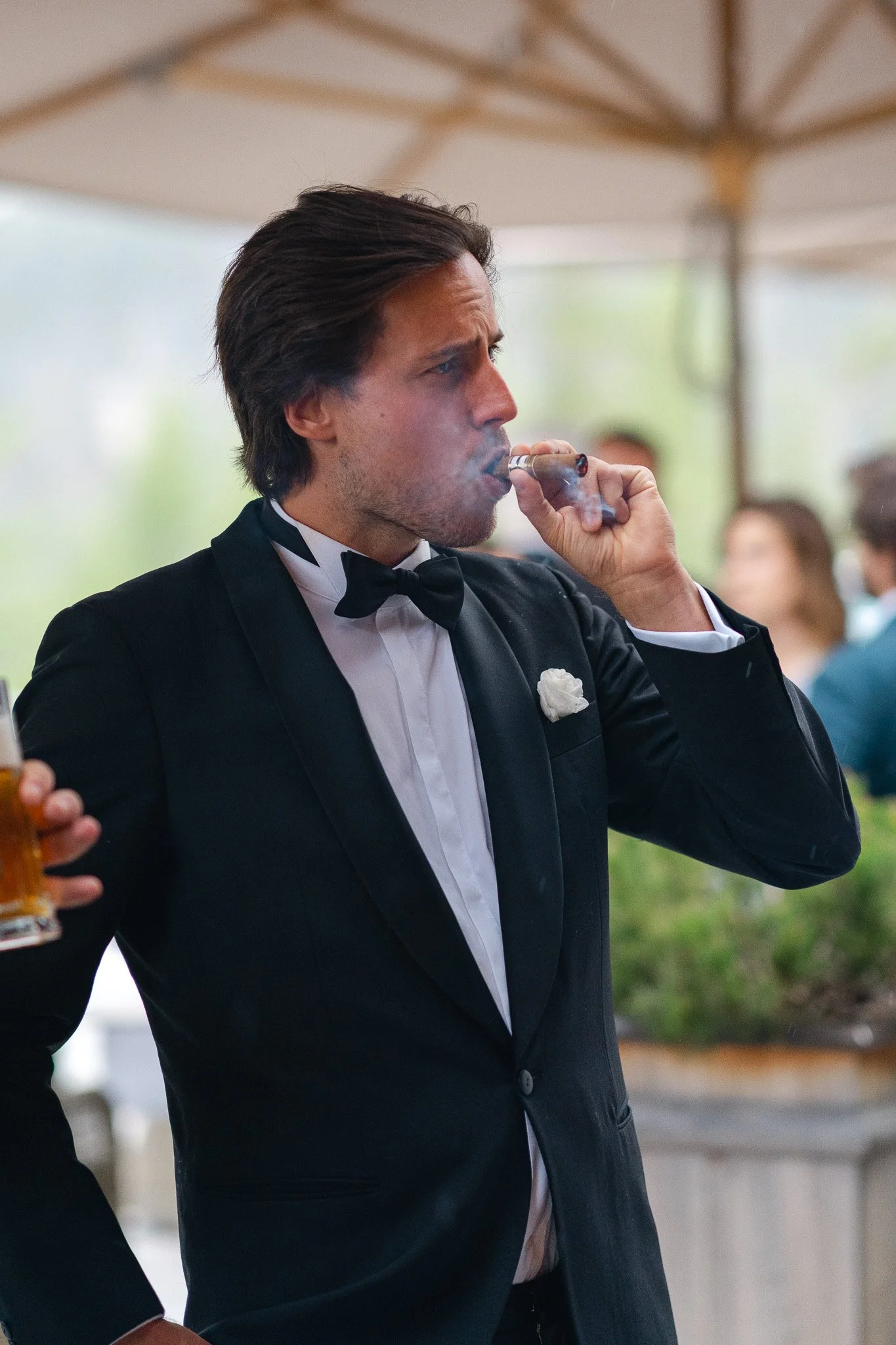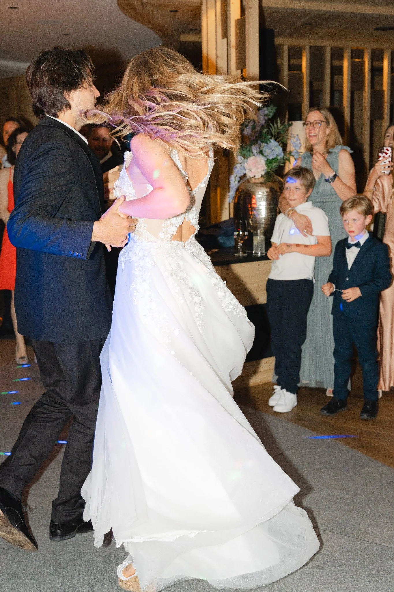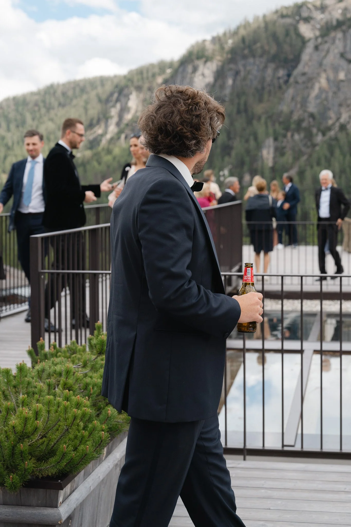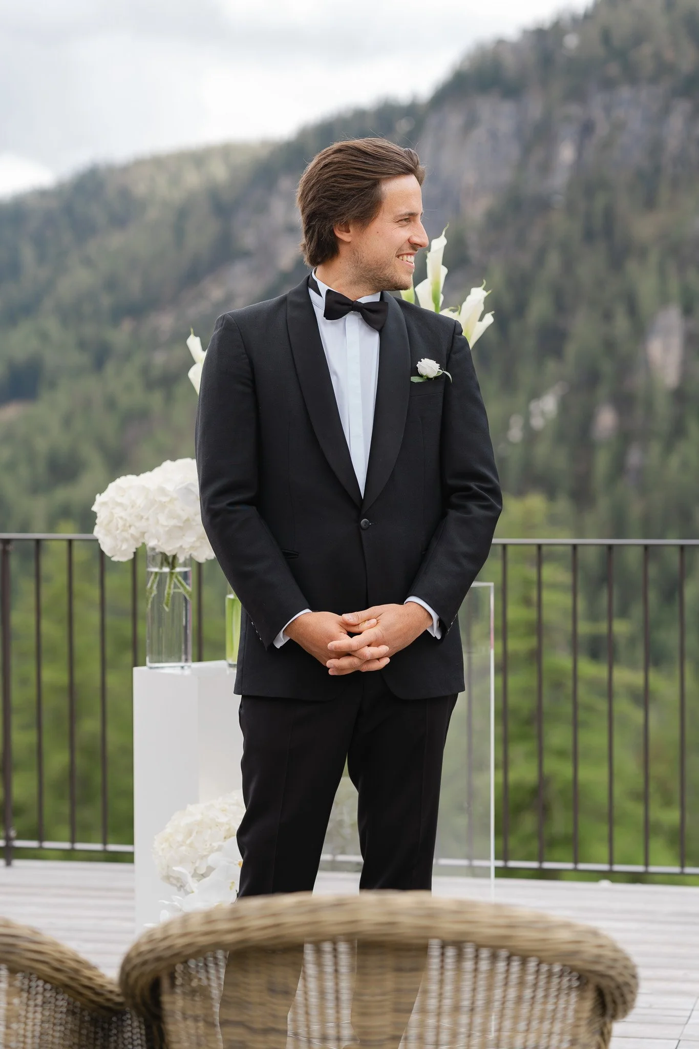 The venue perfectly blended elegance and modernity with stunning mountain views. Anja wore a classic and dreamy dress that perfectly complemented the serene mountain backdrop. After the getting ready session, followed by an intimate first look, the mountain view ceremony was a breathtaking highlight. The reception was nothing short of spectacular, featuring a towering wedding cake that was as delicious as it was beautiful. Besides the mountain scenery, a breathtaking modern table setting with thousands of candles and heartwarming songs performed by a live singer, guests were treated to a wood-fire pizza party, adding a warm and casual touch to the festivities. The after-party was unforgettable, with Anja and Konstantin's powerful first dance setting the tone for the celebration. Every detail was meticulously planned, creating a day full of love and joy. The evening ended with guests under the stars, reminiscing about the day's beautiful moments.